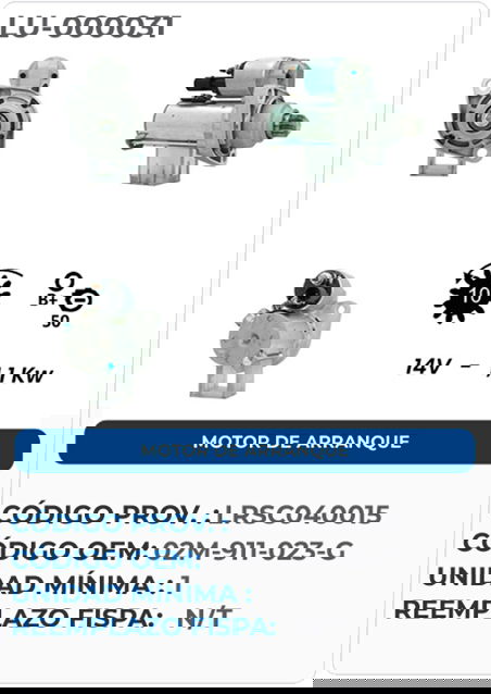 02M911023G - 02M911023M - 438174Volts (V): 12Potencia (Kw): 1,1Dientes: 10Sentido de Rotación: Antiorario