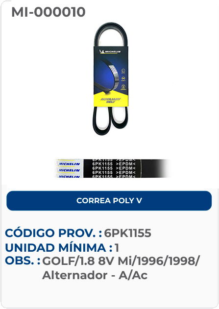 AplicacionesBMW 540i 3.0 24V 2017/⦠/ MITSUBISHI 3000GT 3.0 V6 24V 1992/... / PEUGEOT 307 2.0 8V HDI 2001/2012 / PEUGEOT BOXER 1.9 8V XUD9 1995/2003 / VOLKSWAGEN GOLF 1.8 8V Mi 1996/1998ReferenciasREF.ORIG: 6PK1155