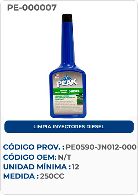 LIMPIA INYECTORES PEAK DIESEL Se trata de un aditivo multifuncional sin cenizas para gas oil formulado con aditivos sintéticos que confieren propiedades anticorrosivas, detergentes y dispersantes para ser usado en tanques de gas oil con el fin de limpiar y mejorar inyectores y combustión.