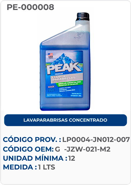 LAVAPARABRISAS PEAK CONCENTRADO es un líquido formulado a base alcoholes y tensioactivos específicos para ser empleado en el sistema de lavado del parabrisas o luneta, el cual diluido con agua provee limpieza y evita la formación de escarcha sobre los cristales. Además, su formulación contiene un inhibidor de corrosión para proteger todo el sistema de dilución, carga y aplicación de la solución de limpieza.